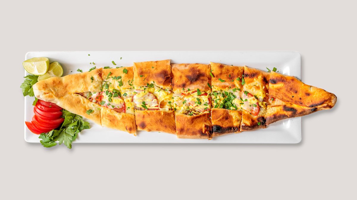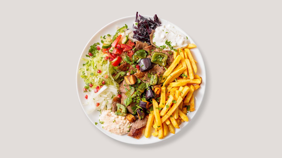 mit Pommes frites, Reis, extra Kalbfleisch, Salat, Hirtenkäse, Zwiebeln und einer Soße deiner Wahl