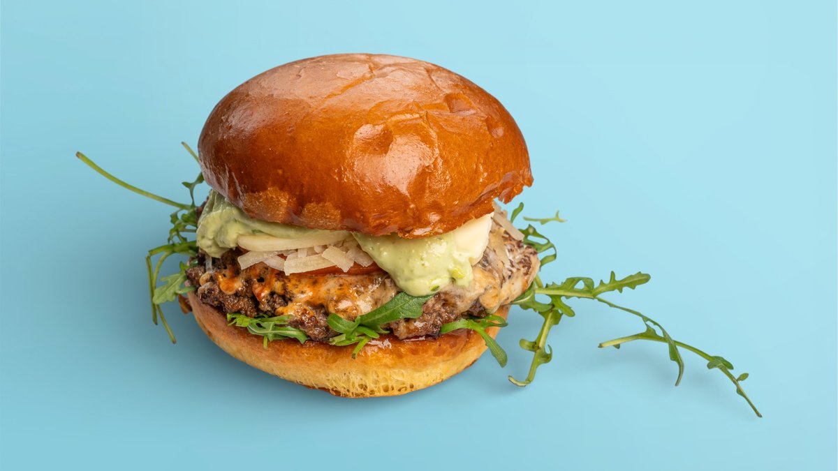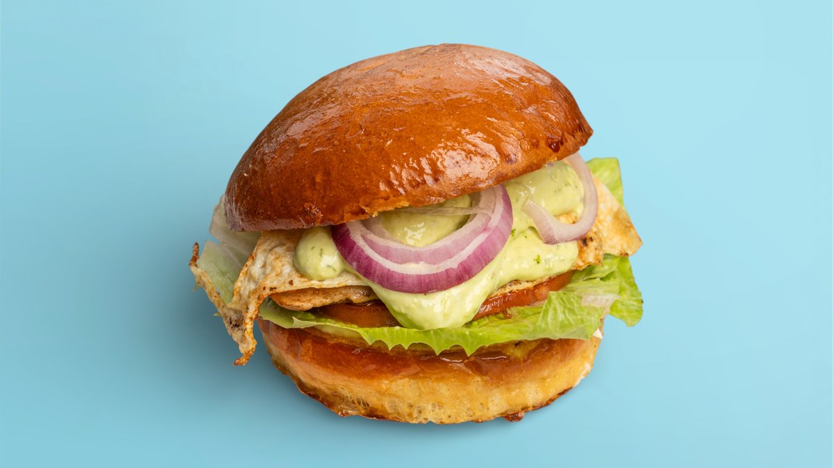 mit Vollkorn-Brötchen, gegrilltem Hähnchenbrustfilet, Avocadocreme, Spiegelei und Mozzarella