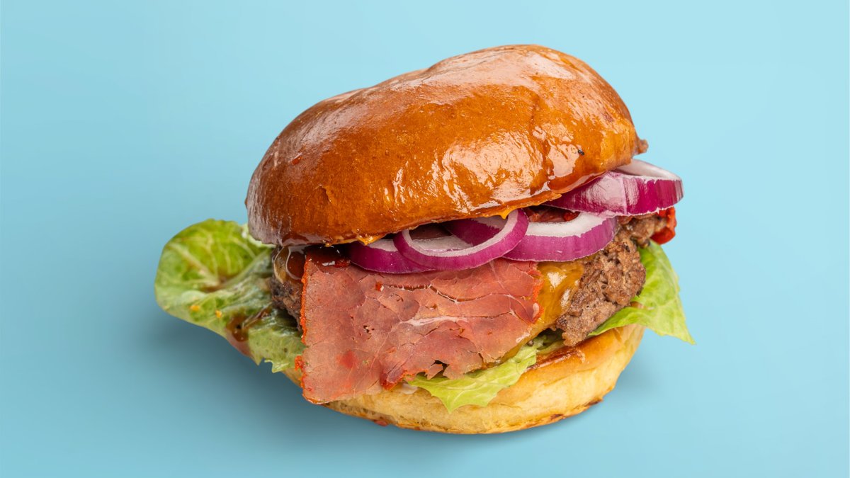 mit BarbecuesoĂźe, Speck vom Rind, Cheddar und Zwiebeln