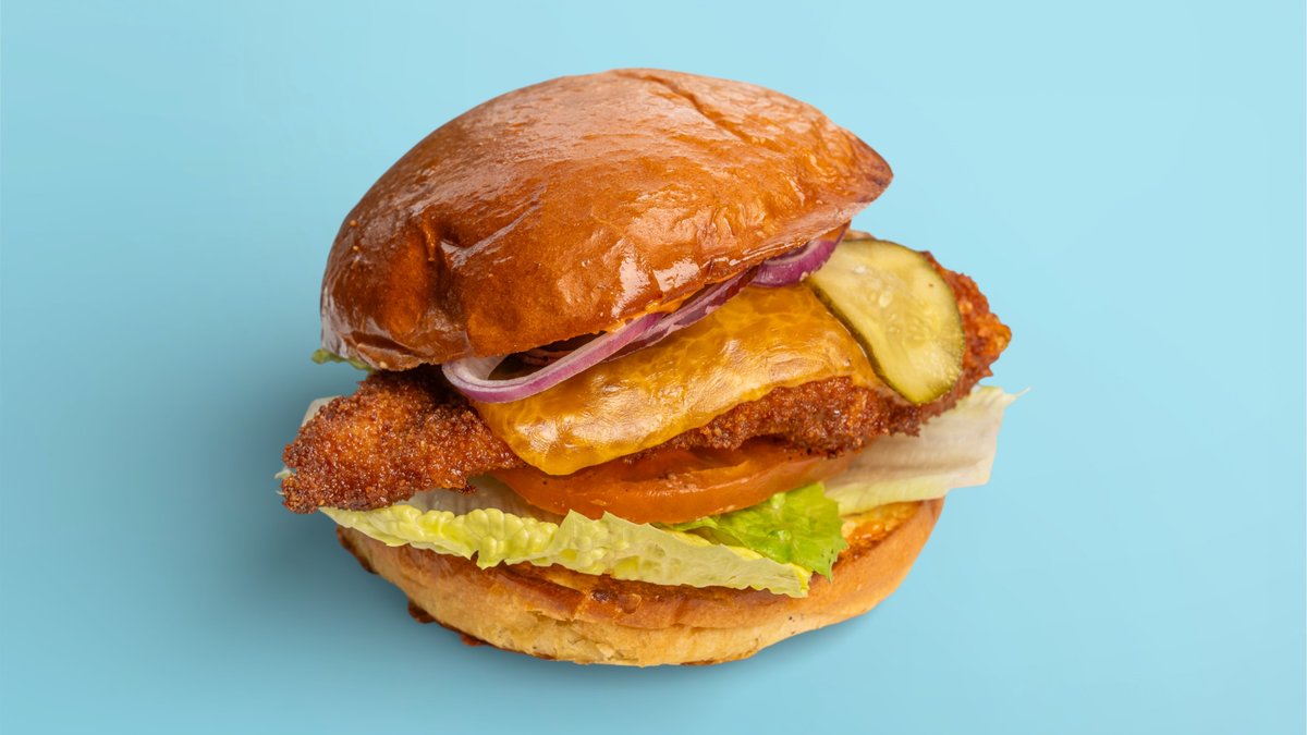 mit Sesam-Brötchen, paniertem Hähnchenbrustfilet, Starsoße, Cheddar und Gewürzgurken