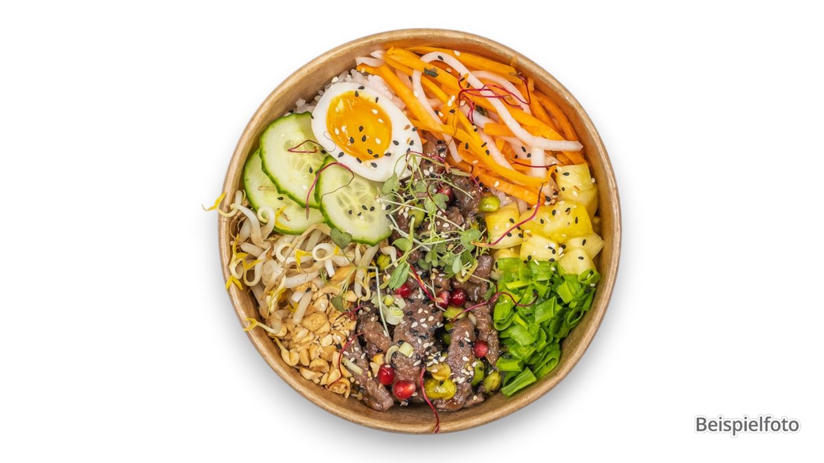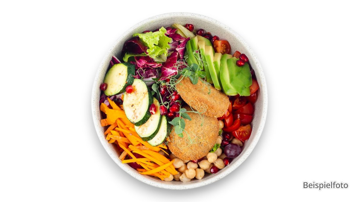 alle Bowls werden mit Salat-Mix, Gurken, Möhren, Mais, Walnüssen und einem Dressing deiner Wahl zubereitet