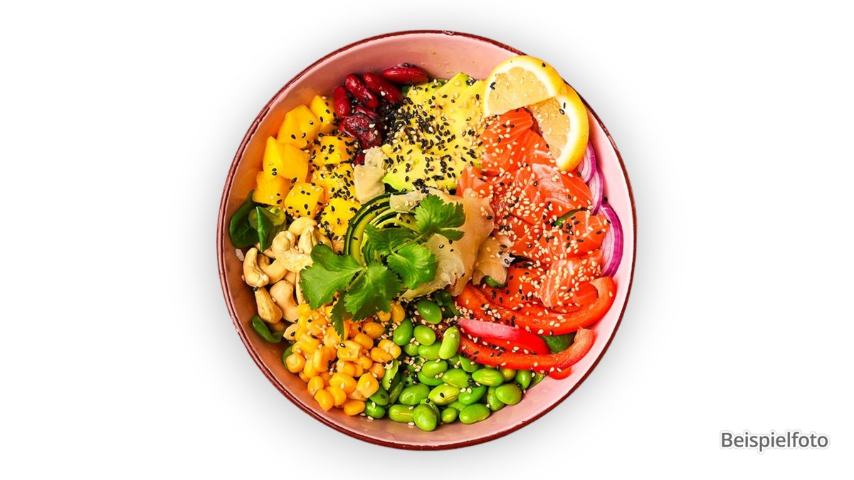 mit Basmatireis, Lachs, Kirschtomaten, Rote Beete, Mango und Avocado