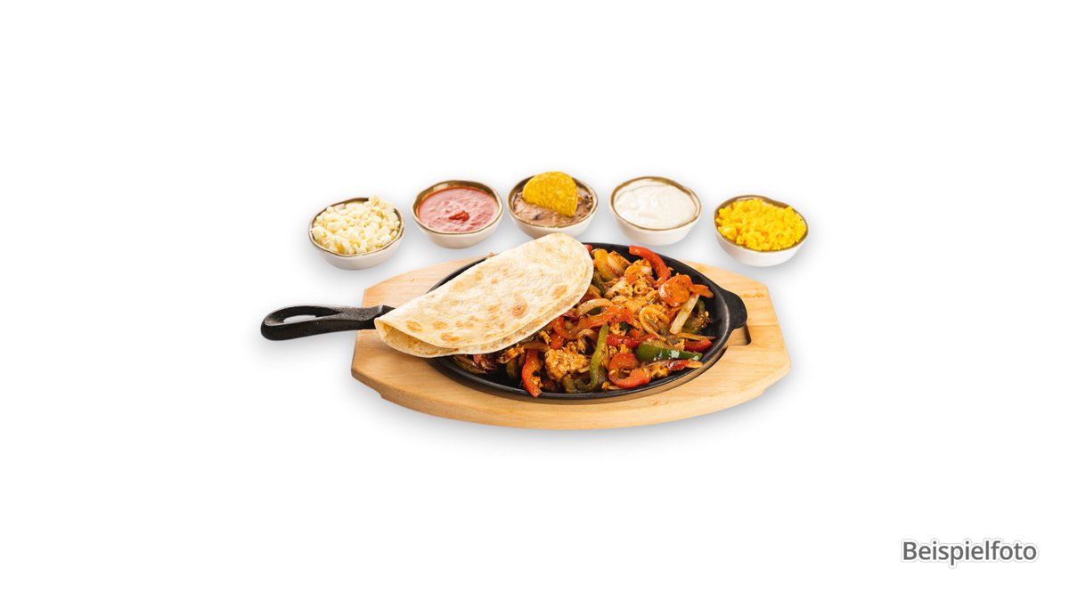 mexikanische Spezialität-marinierte Fleischstreifen mit Paprika, gebratenem Zwiebeln, Avocadocreme, Sauerrahm, Pico de Gallo, Käse, 3 warme Tortillas zum füllen sowie Reis
