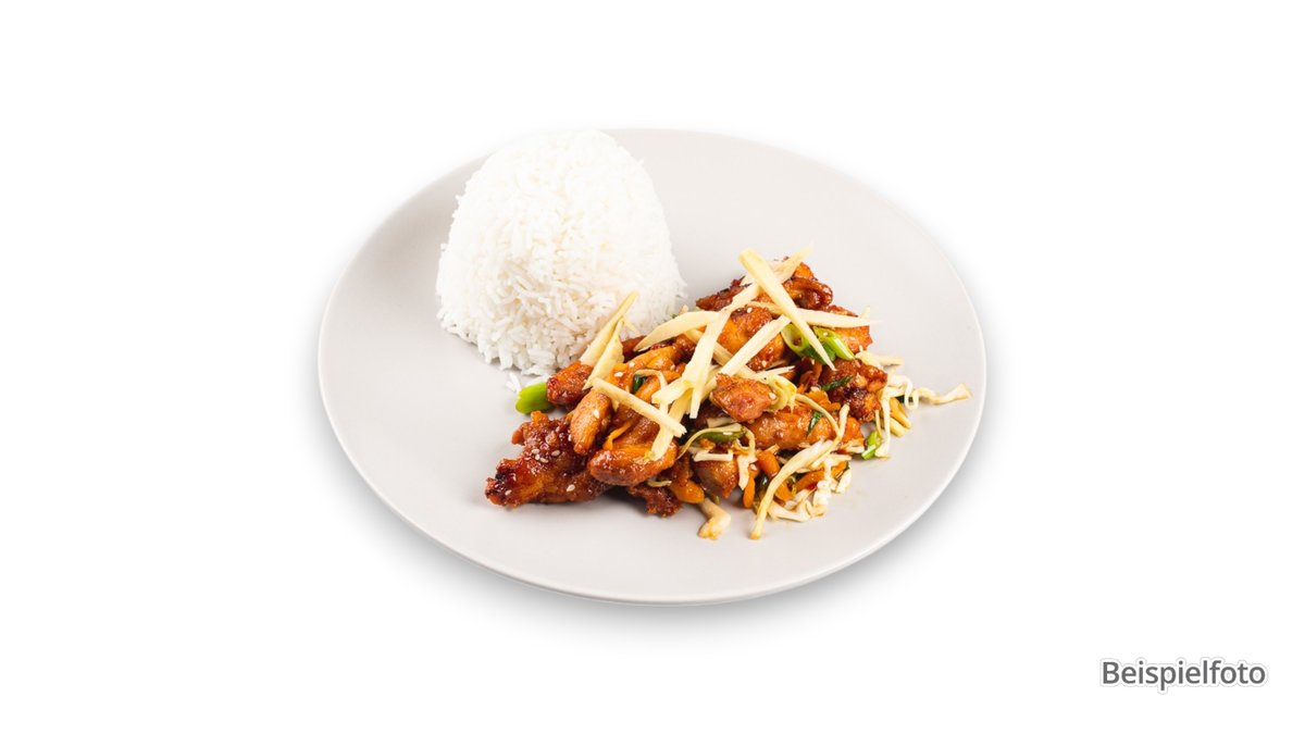 gebratene Putenbruststreifen mit frischem Gemüsemix in Sweet Chili Sauce, dazu Reis