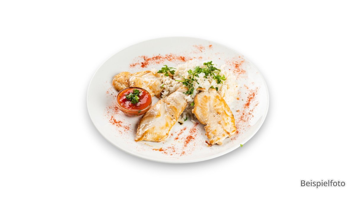 Putenstreifen in Mango Chutney auf frischen Paprikascheiben, dazu Basmatireis