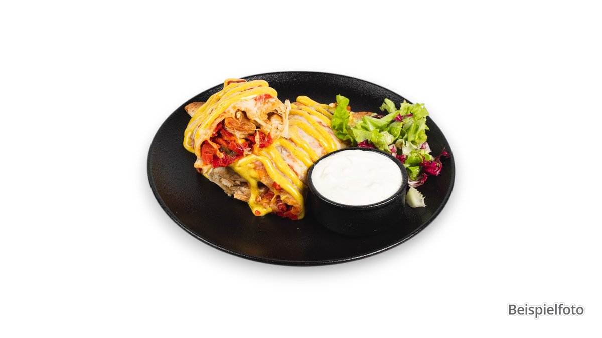 große Weizentortilla als Tasche geformt, gefüllt mit Paprika, Zwiebeln und Käse, serviert mit Sauerrahm und Chilisoße