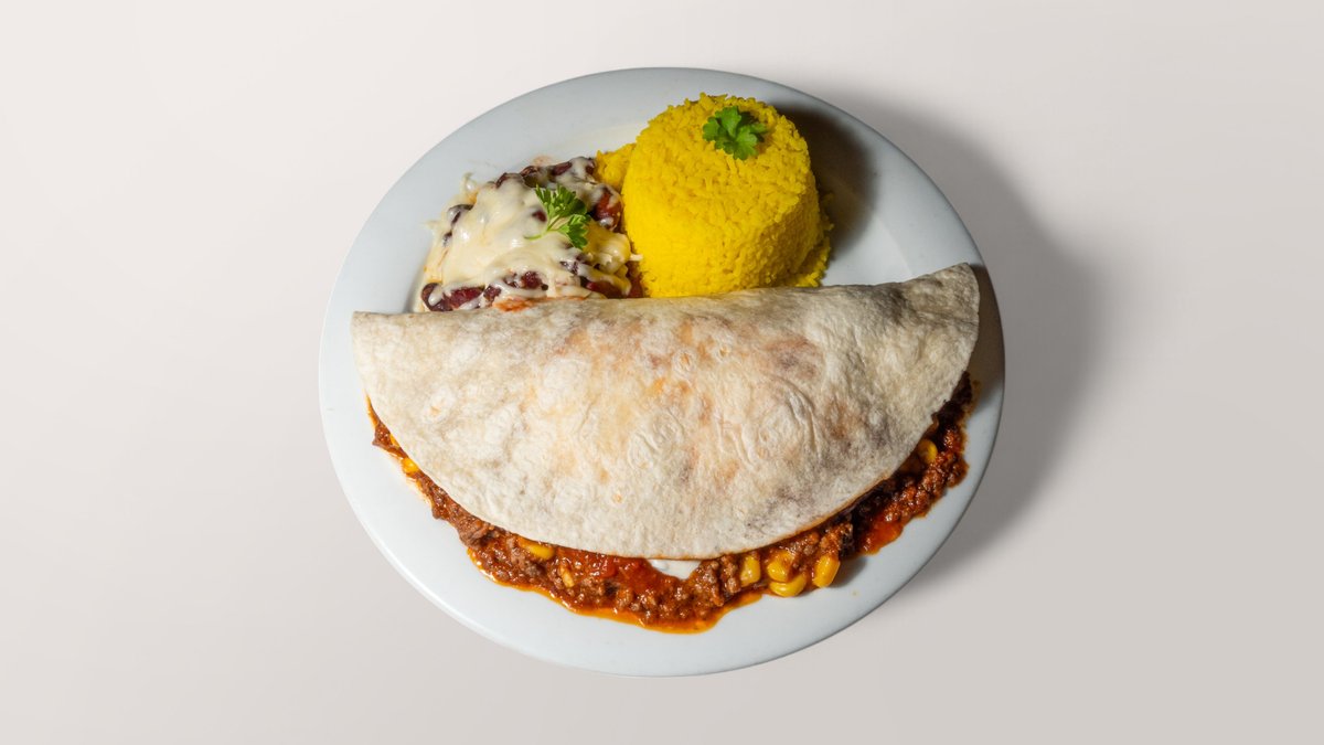 große Weizentortilla, als Kugel geformt gefüllt mit Paprika und Zwiebeln, überzogen mit Chilisoße und mit Käse überbacken, als Beilage Reis und mexikanische Bohnen