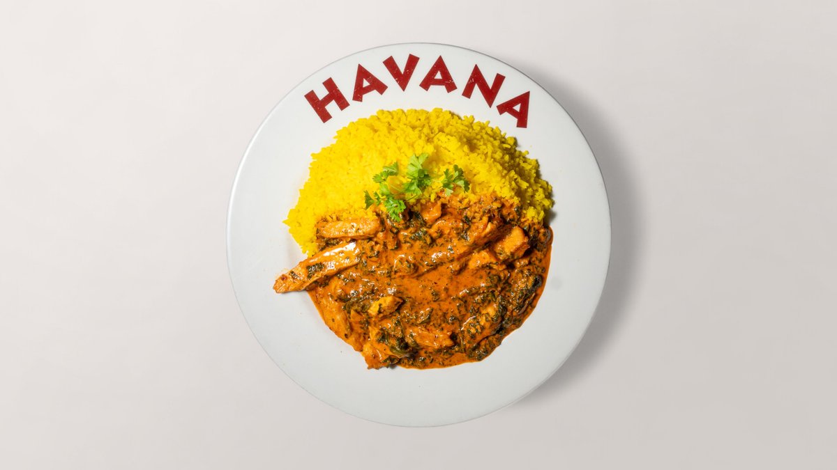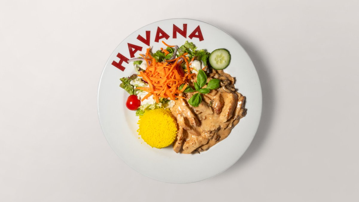 mit Hähnchenbruststreifen und Champignons, überzogen mit Havana-Soße