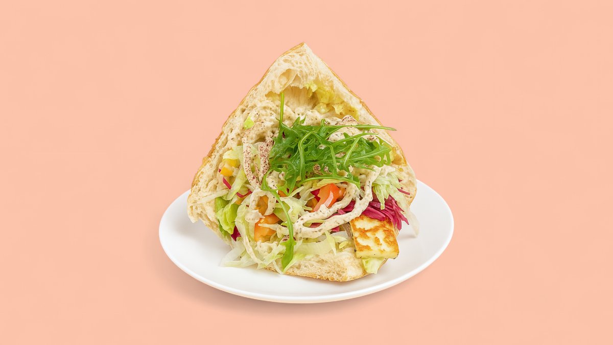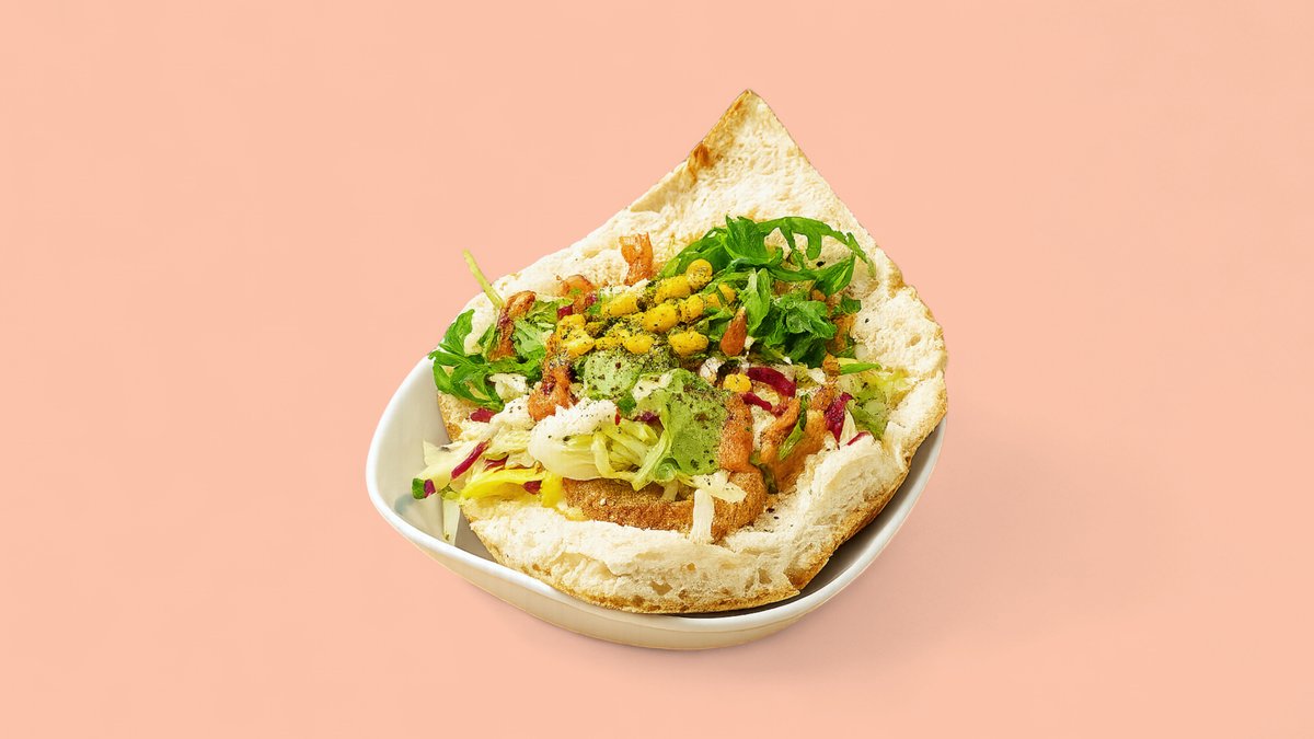 mit Eisbergsalat, Tomaten, Gurken, Zwiebeln und Rucola