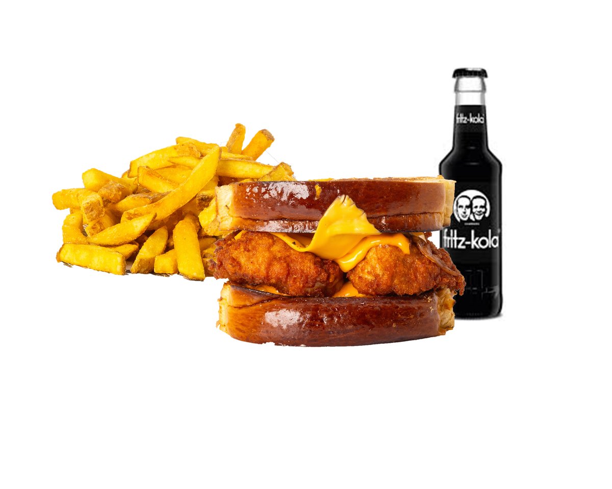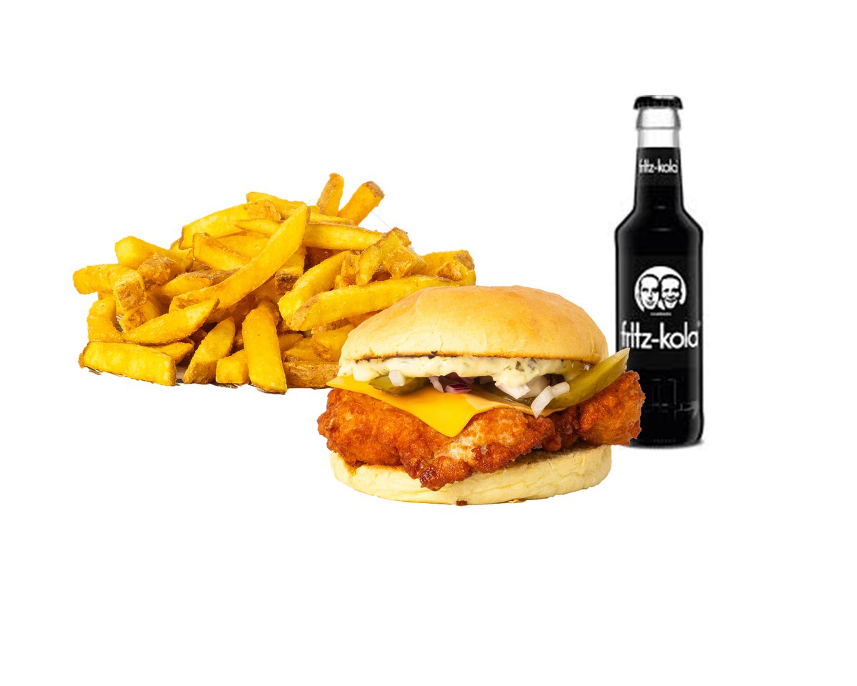 mit Potato Bun, Buttermilk Chicken, Cheese, Zwiebelwürfeln, sauren Gurken & green Aioli