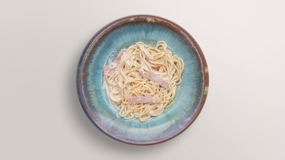 mit Sahnesoße, Bacon, Ei, Champignons und Knoblauch