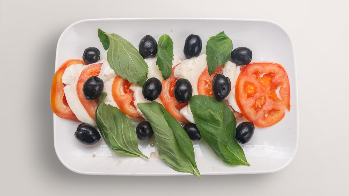 mit Tomaten, Mozzarella, Oliven und Basilikum