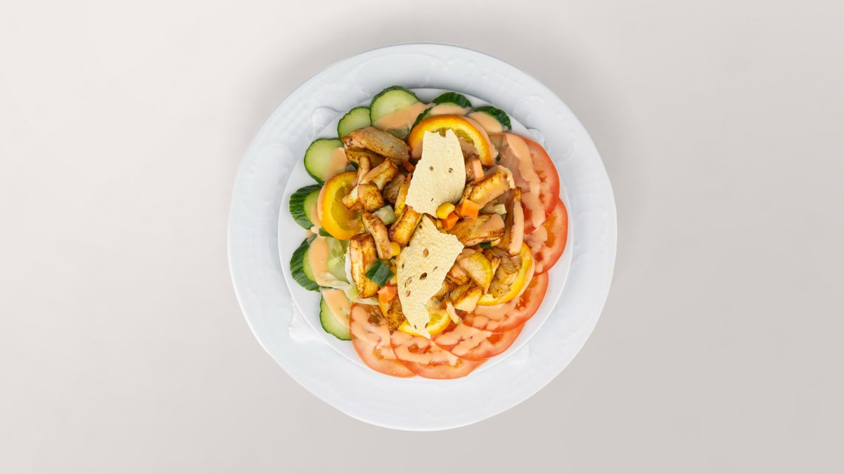 gemischter Salat mit gebratenem Hühnerfleisch, frischem indischem Rahmkäse, Papadam und indischen Soßen