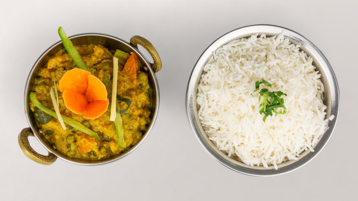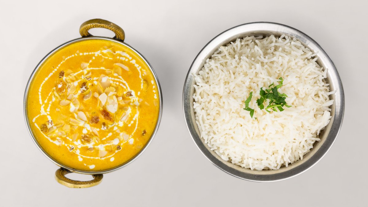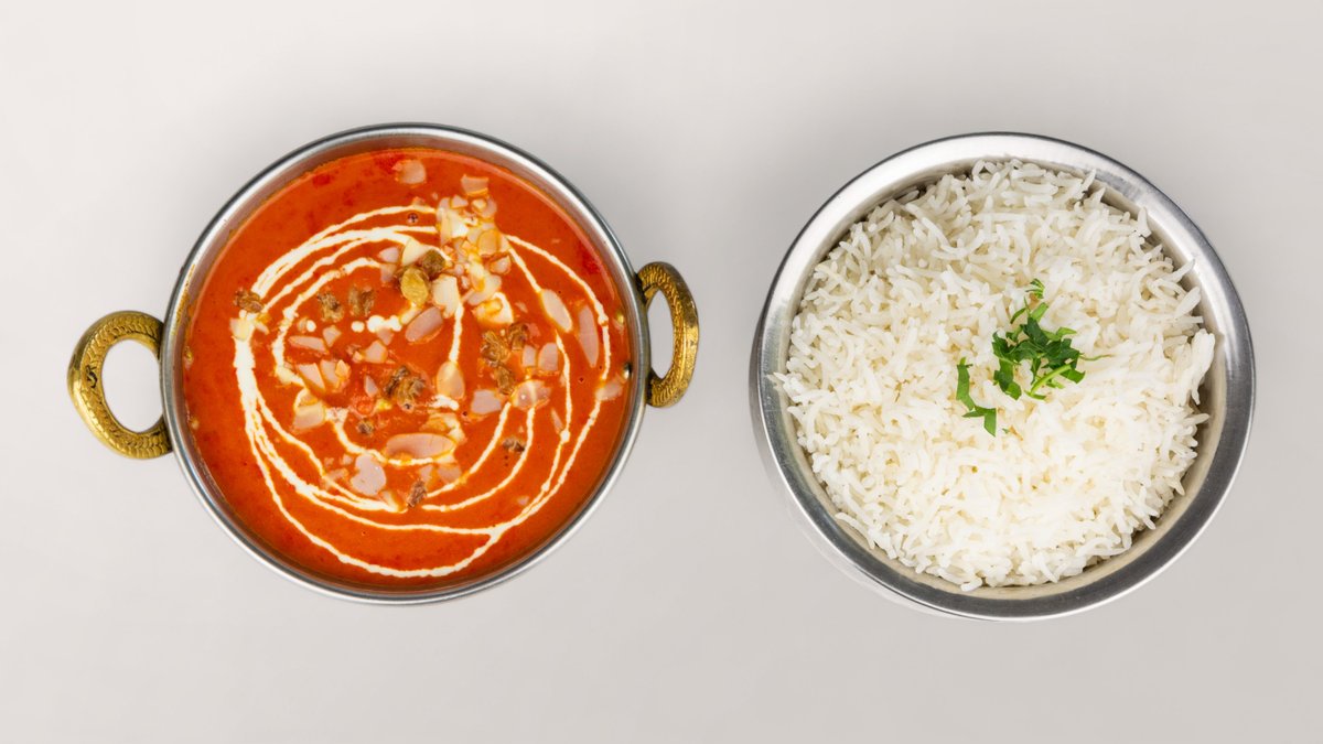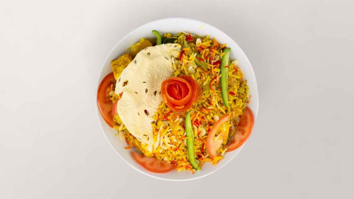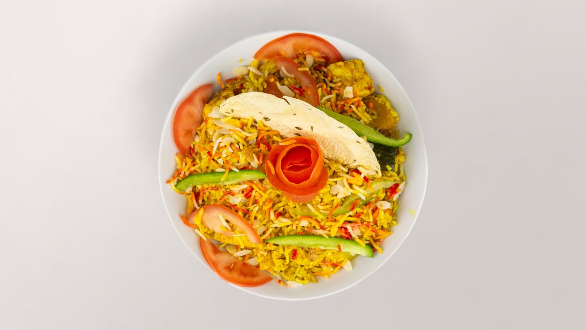 alle Reisgerichte werden mit Basmatireis, frischen Tomaten, Mandeln, Rosinen, Salat, Papadam und verschiedenen Soßen zubereitet