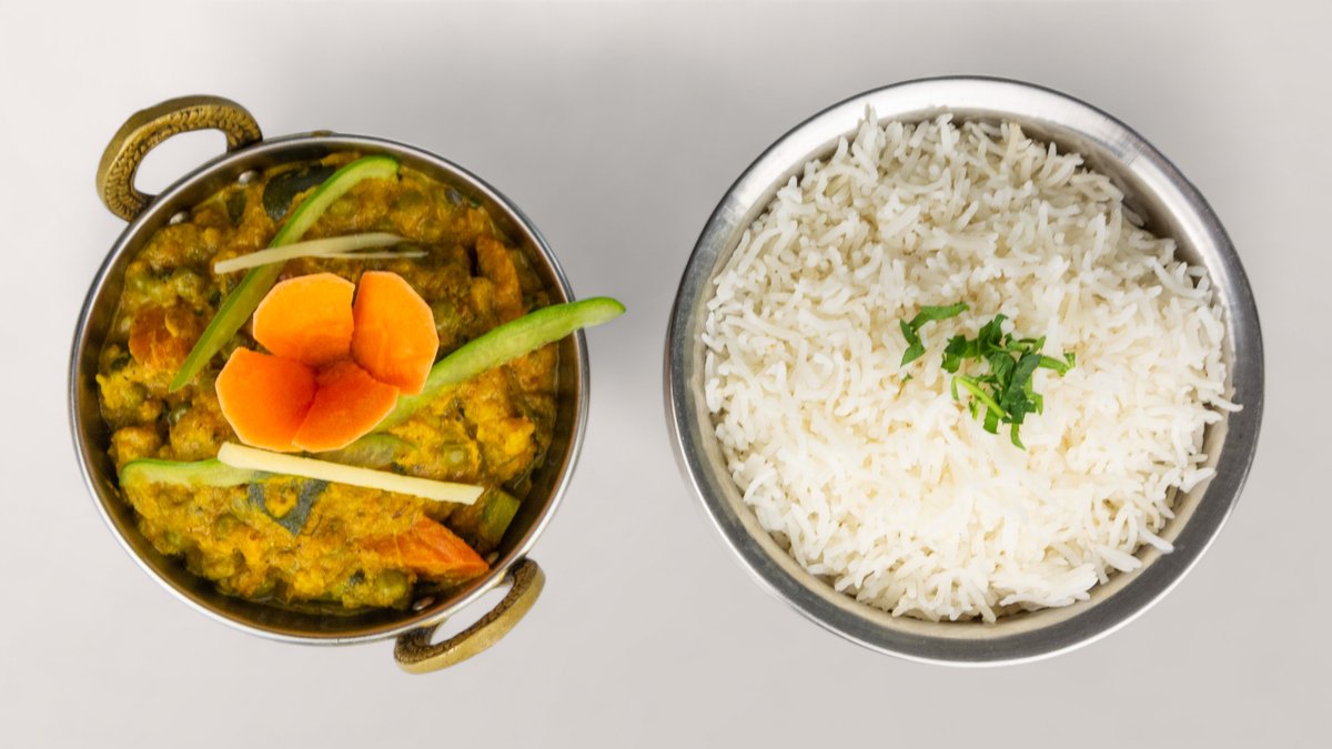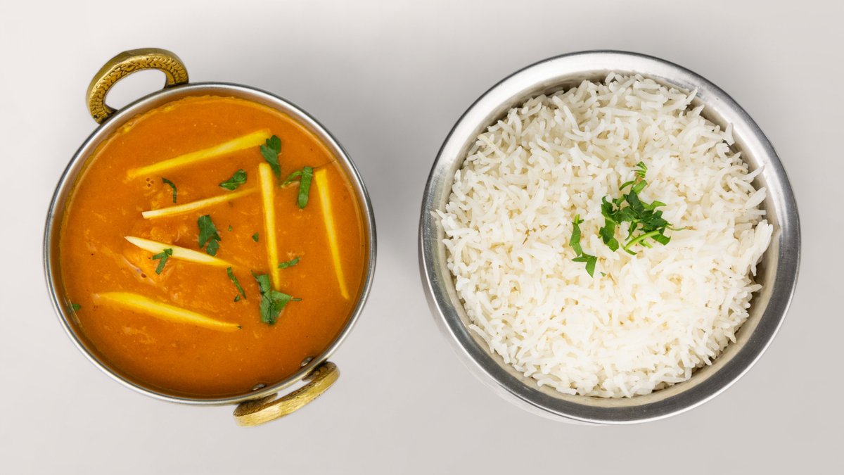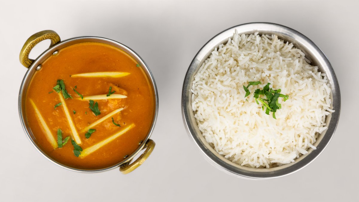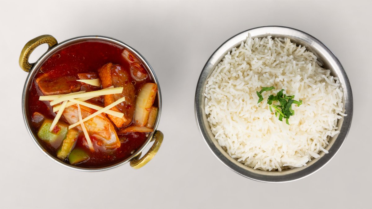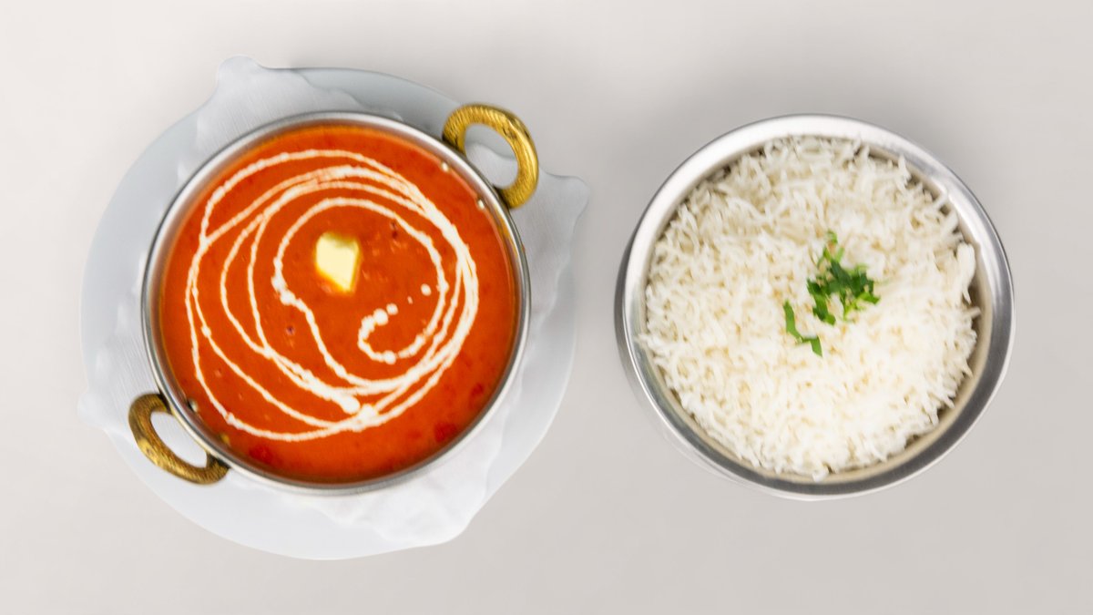 alle Reisgerichte werden mit Basmatireis, frischen Tomaten, Mandeln, Rosinen, Salat, Papadam und verschiedenen Soßen zubereitet