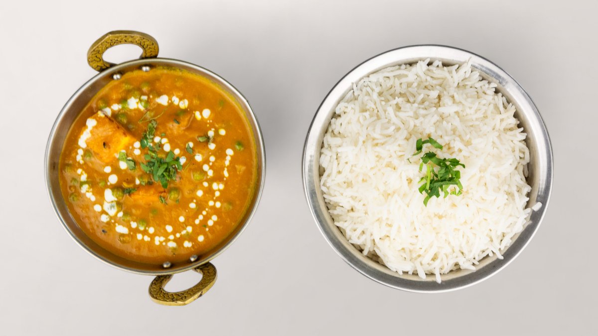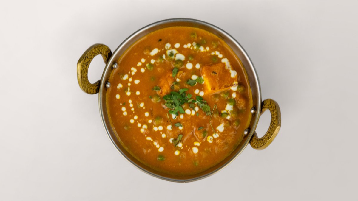 mit hausgemachtem indischem Rahmkäse, grünen Erbsen, Tomaten und Currysoße