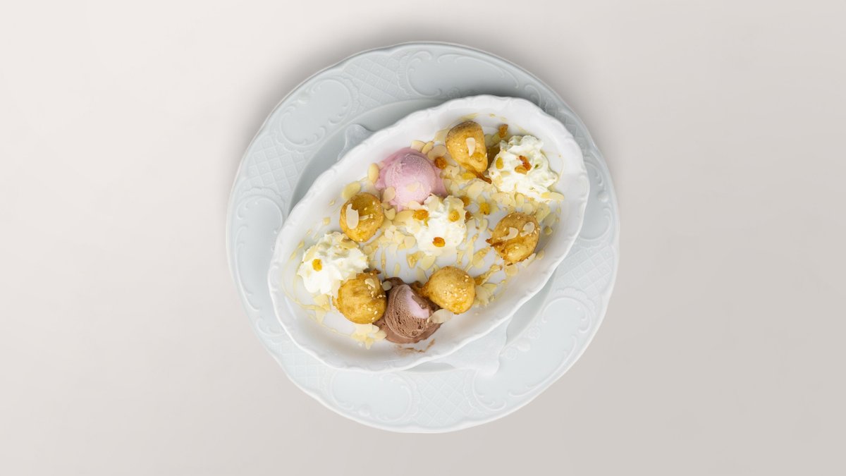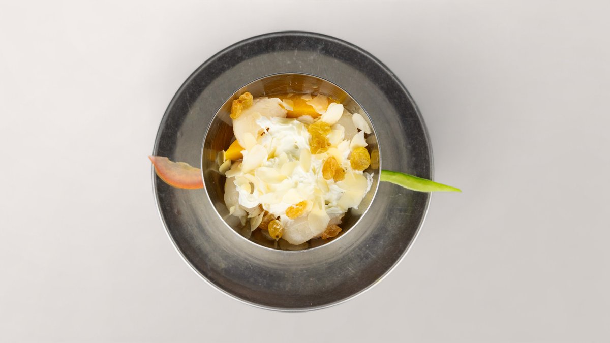 mit hausgemachtem indischem Rahmkäse, Rosinen, Mandeln und Sahnesoße