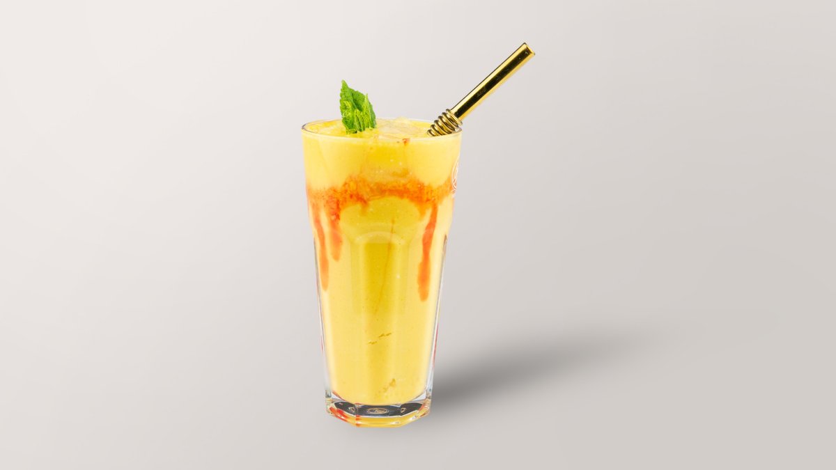 Indisches Joghurtgetränk mit pürierter Mango, süß und erfrischend.
