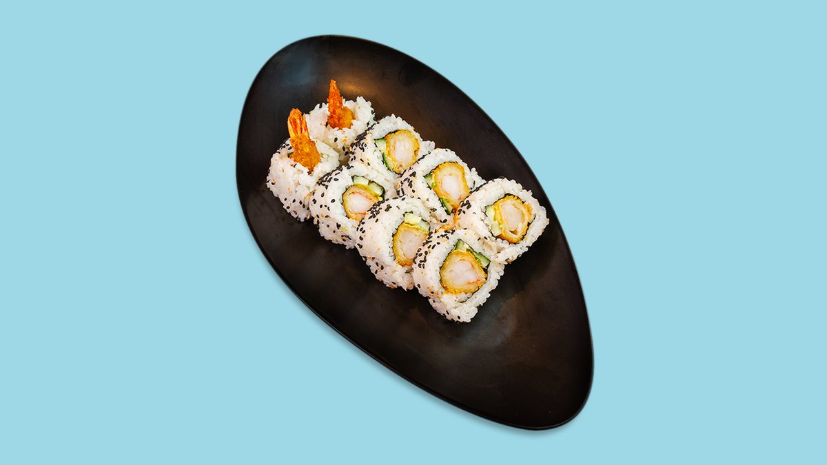 mit Ebi Tempura, Gurken, Schnittlauch, Chili-Limetten-Creme und Sesam
