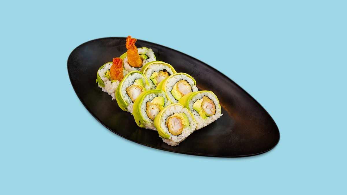 mit Tempura Garnelen, Gurken, Chilli-Limetten-Creme und Avocadomantel