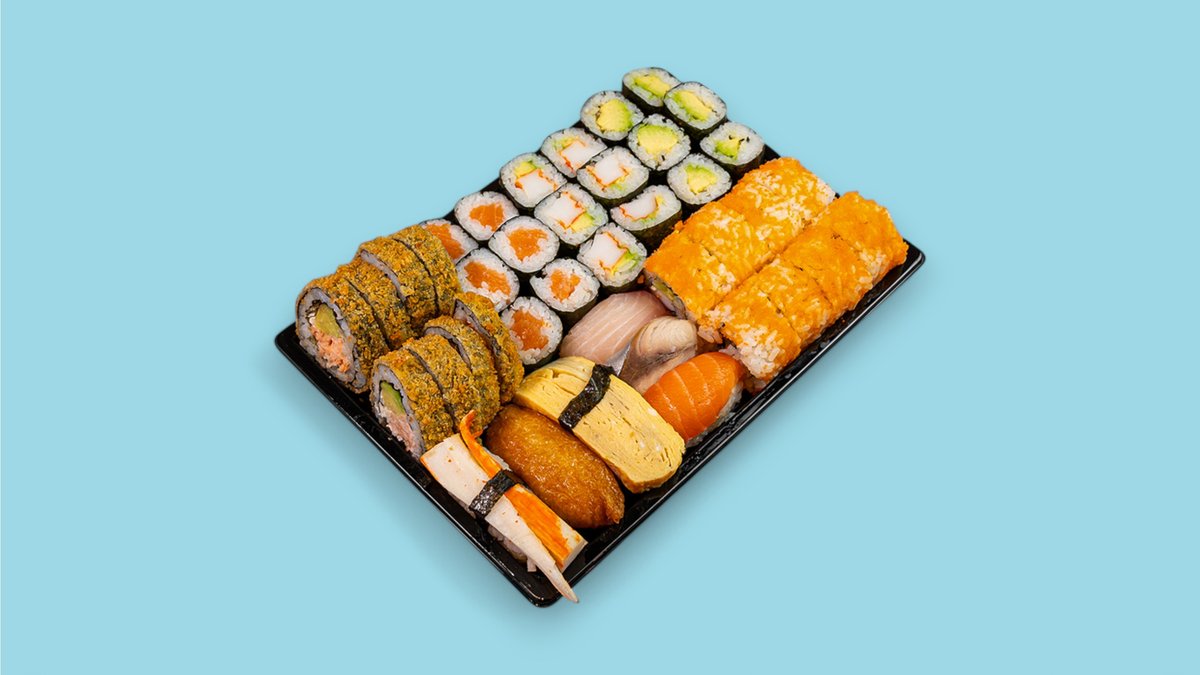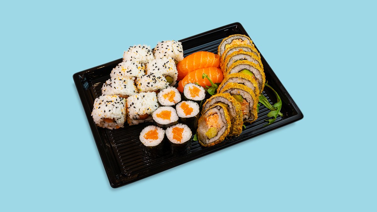 10x verschiedene Nigiri 6x Sake Maki 6x Tekka Maki 6x California Maki 6x Ebi California Maki 8x King California Tempura 8x Sashimi Mix 8x London Subway 8x Shake Avo Roll 8x Crispy Ebi Roll 5x Tory Gyoza