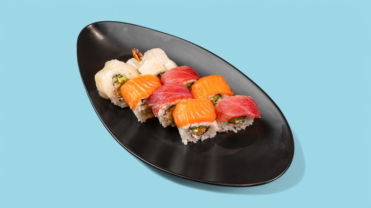 mit Avocado, Gurken, Ebi Tempura and Frischkäse, ummantelt mit Lachs, Thunfisch und Jakobsmuscheln