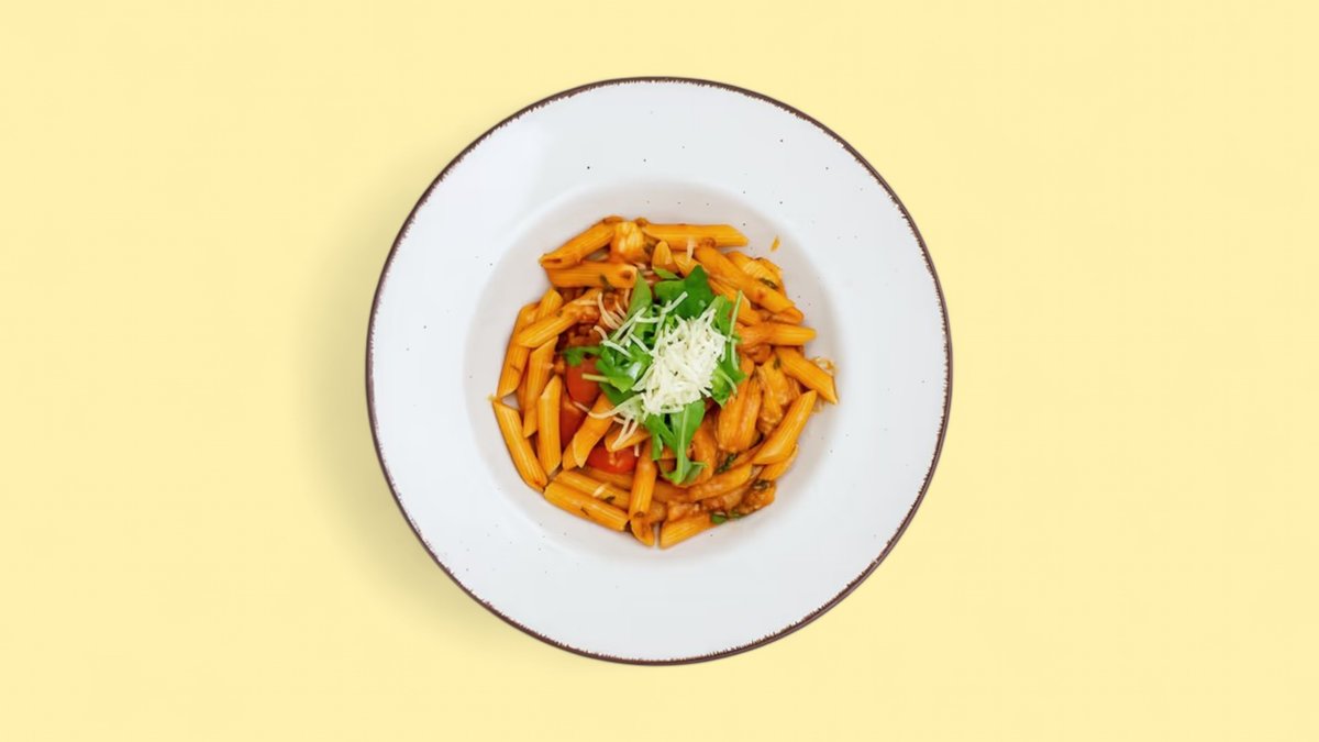 kurze Nudeln mit Hähnchenbrust und frischen Champignons in Sahnesoße
