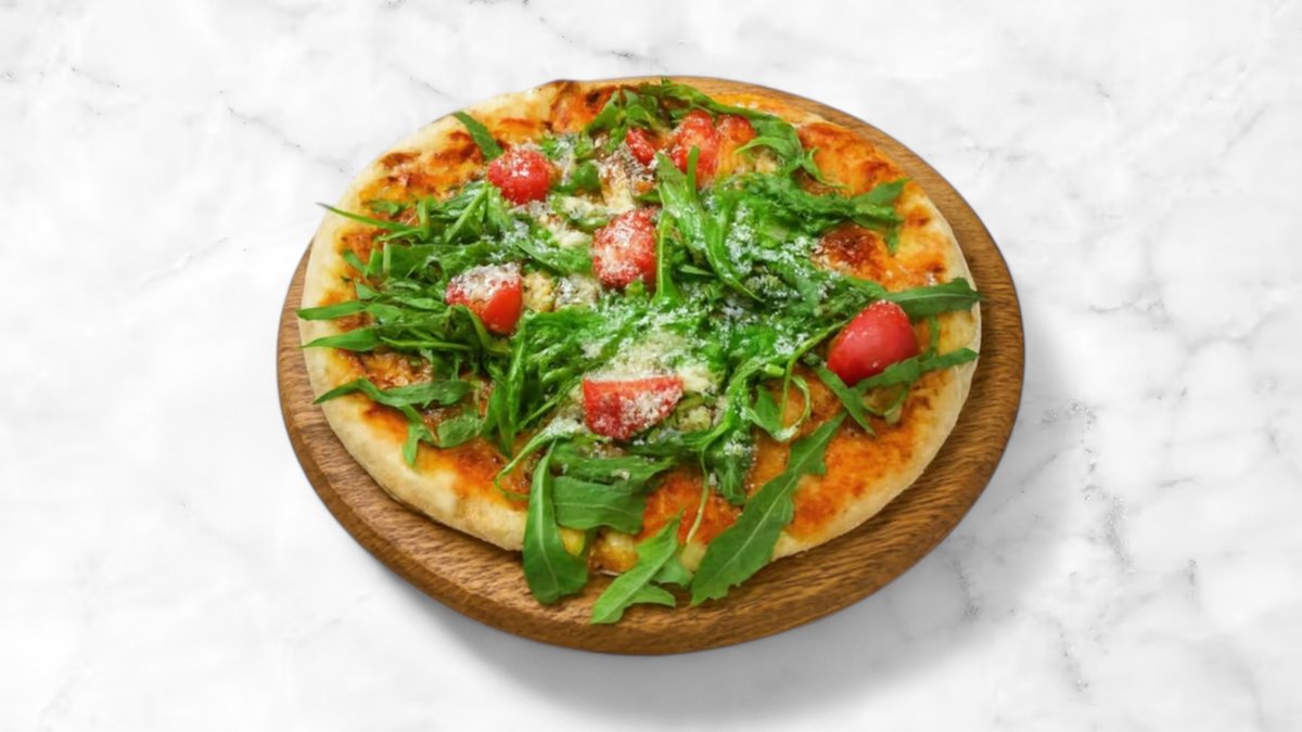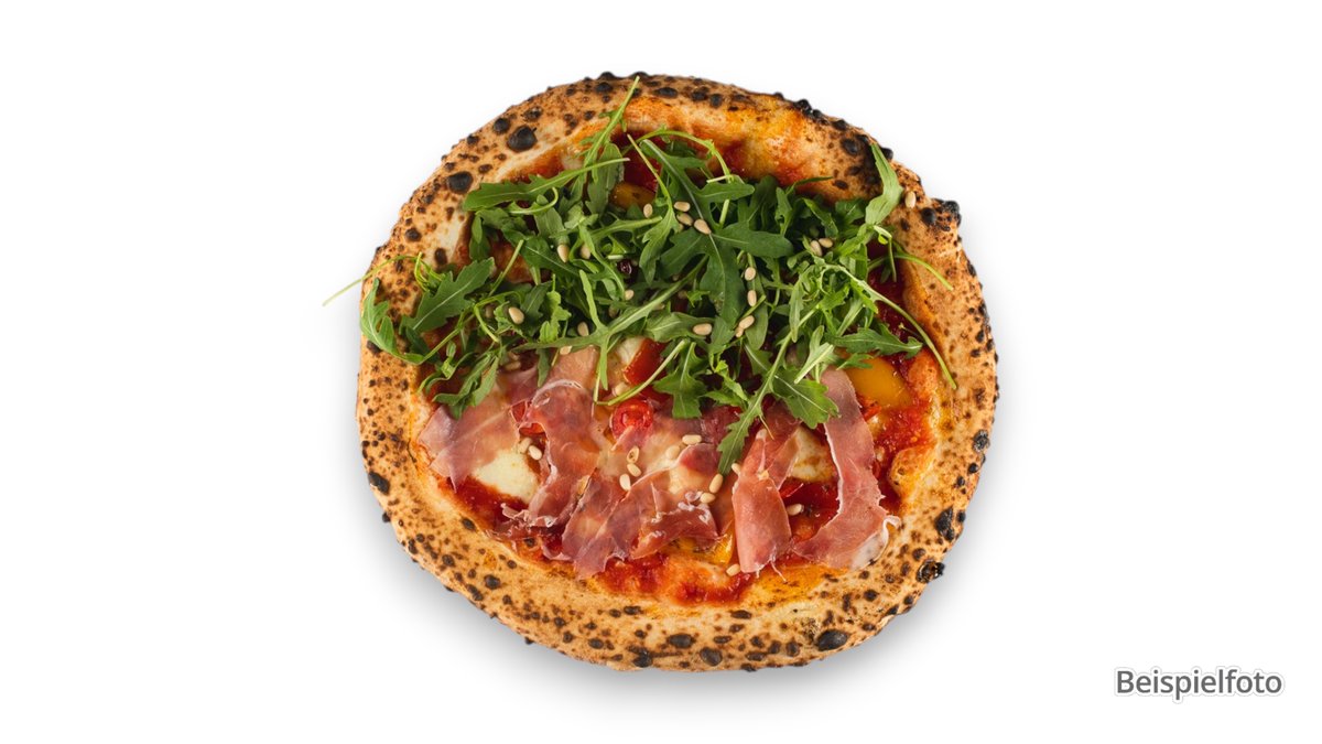 mit Spinat, Paprika, Zucchini, Aubergine, Champignons und Rucola
