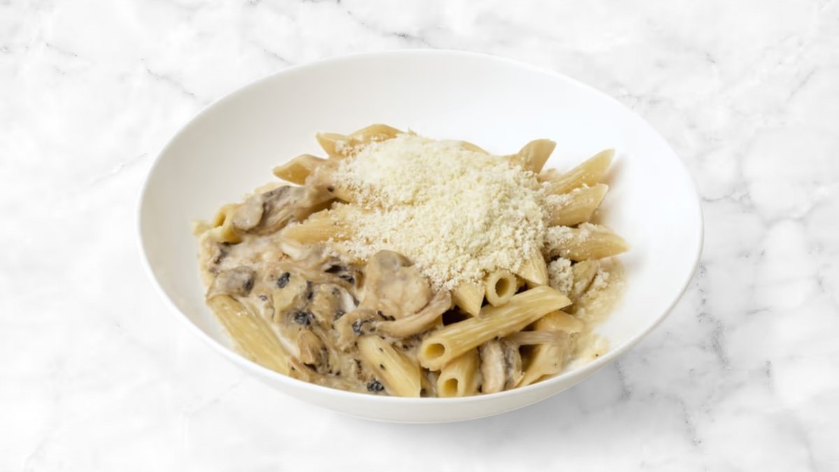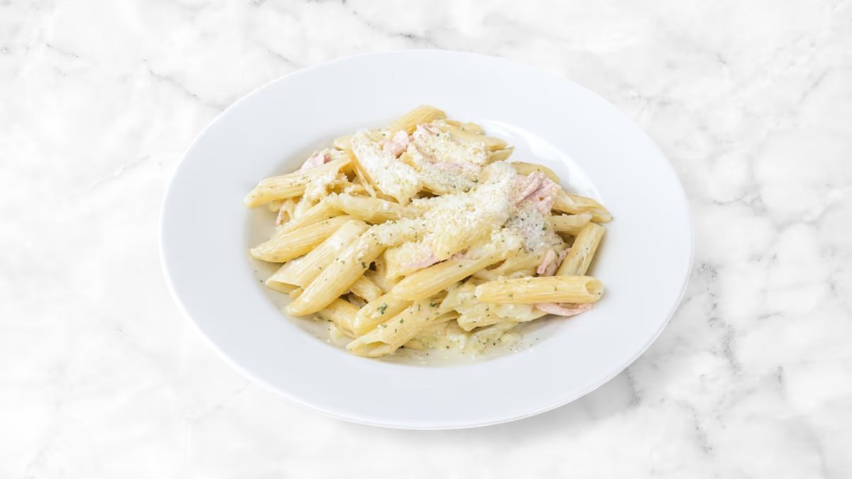 Sahnesoße, Schinken vom Schwein, Knoblauch und Käse überbacken