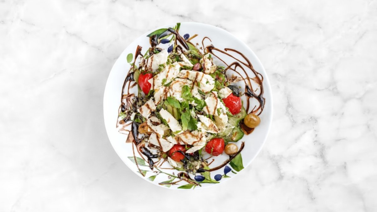 Rucolasalat mit gebratenen Hähnchenbrust, Kirschtomaten, Champignons, Parmesan und hausgemachtes Joghurtdressing