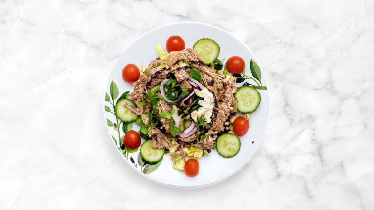 Thunfisch, Eisbergsalat, Ei, Gurken, Kirschtomaten, Karotten, Peperoni, Oliven und Zwiebeln