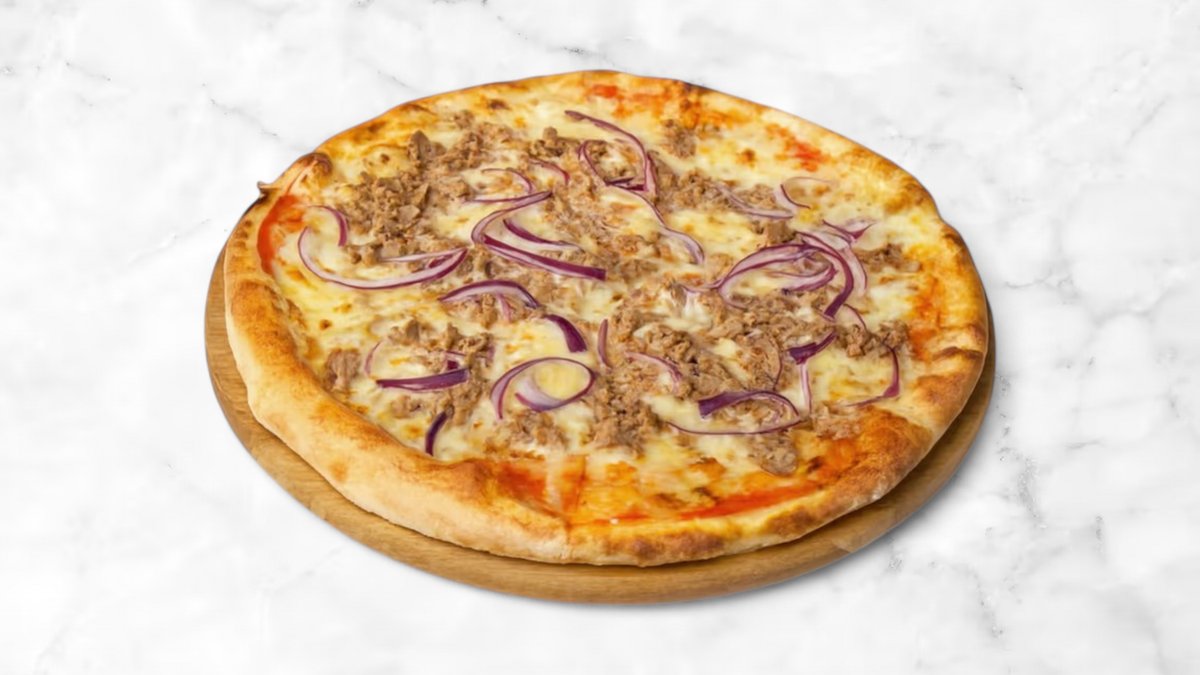 mit Tomatensoße, Mozzarella, Thunfisch, Zwiebeln, Oliven, Fetakäse und Petersilie
