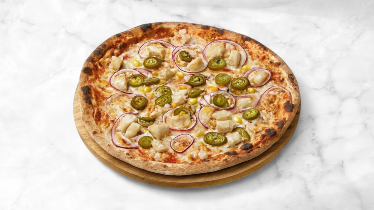 mit Barbecuesoße, Morzarella, Hänchenbrust, Zwiebel, Mais und Jalapeños