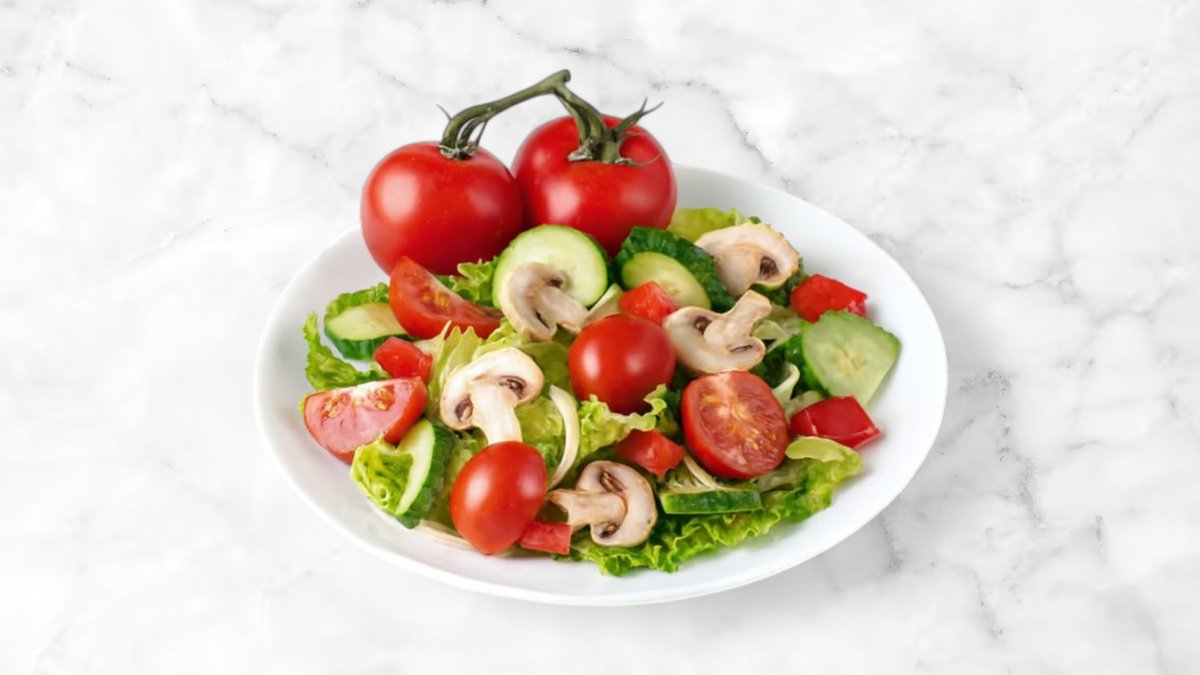 Eisbergsalat, Gurken, Kirschtomaten, Karotten, Peperoni, Oliven und Zwiebeln
