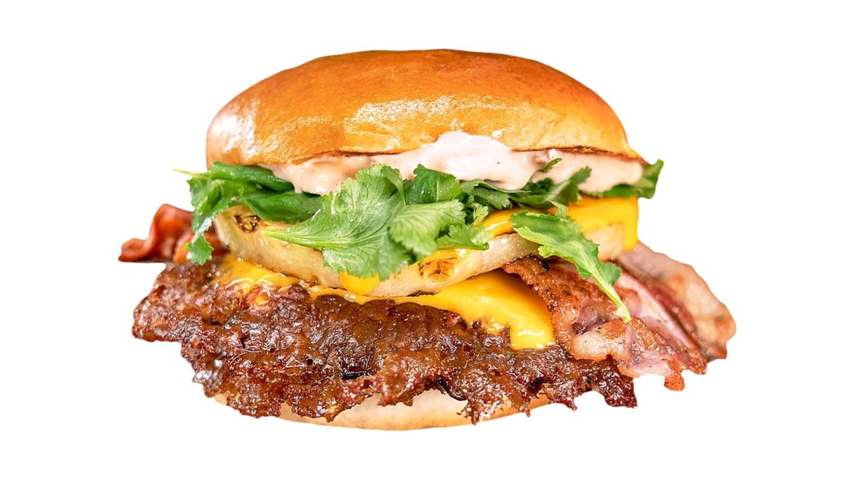mit Rindfleisch, Speck, Ananas, Cajungewürz, Chipotle-Mayonnaise, dreifachem Cheddar, Zwiebeln und Koriander im veganen Brioche-Brötchen