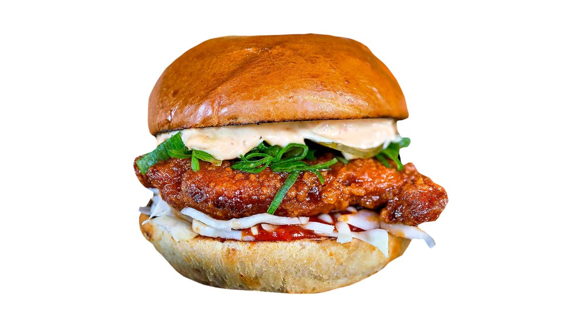 mit saftig frittiertem rosa Keulenfleisch, Gochujang-Ketchup, Kimchi-Mayonnaise, Gurken, Kohl und Frühlingszwiebeln im veganen Brioche-Brötchen