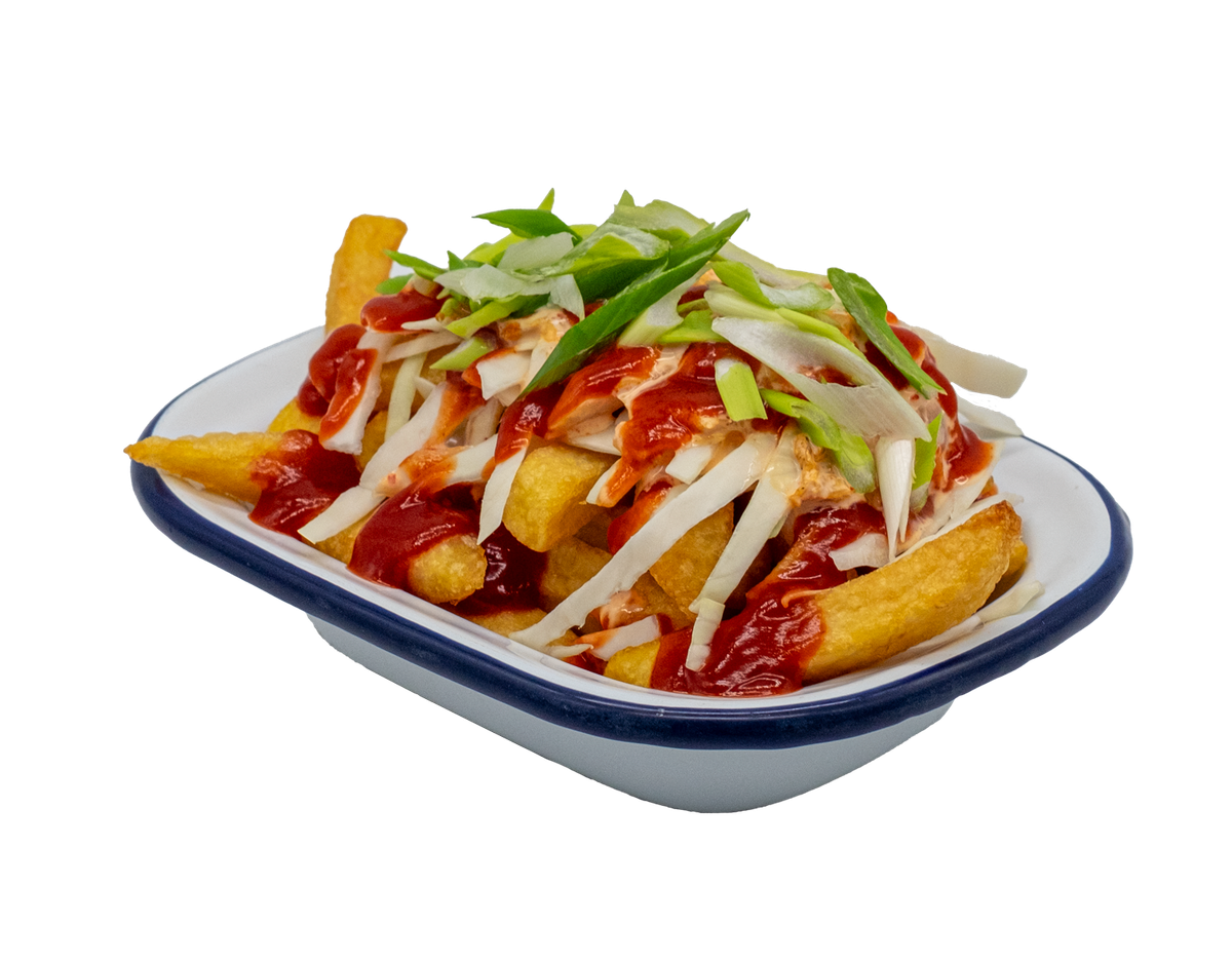 mit Pommes frites, Kohl, Kimchi-Mayonnaise, Gochujang-Ketchup und Frühlingszwiebeln