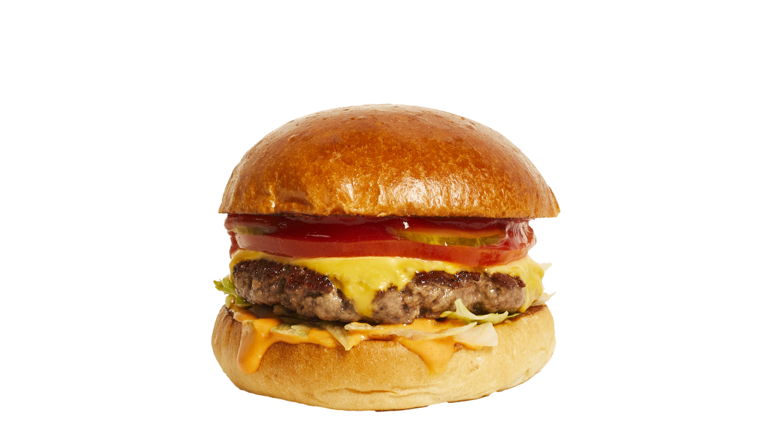 mit doppeltem Rindfleisch, doppeltem Cheddar, Salat, Tomaten, Gurken, Burgersoße und Ketchup