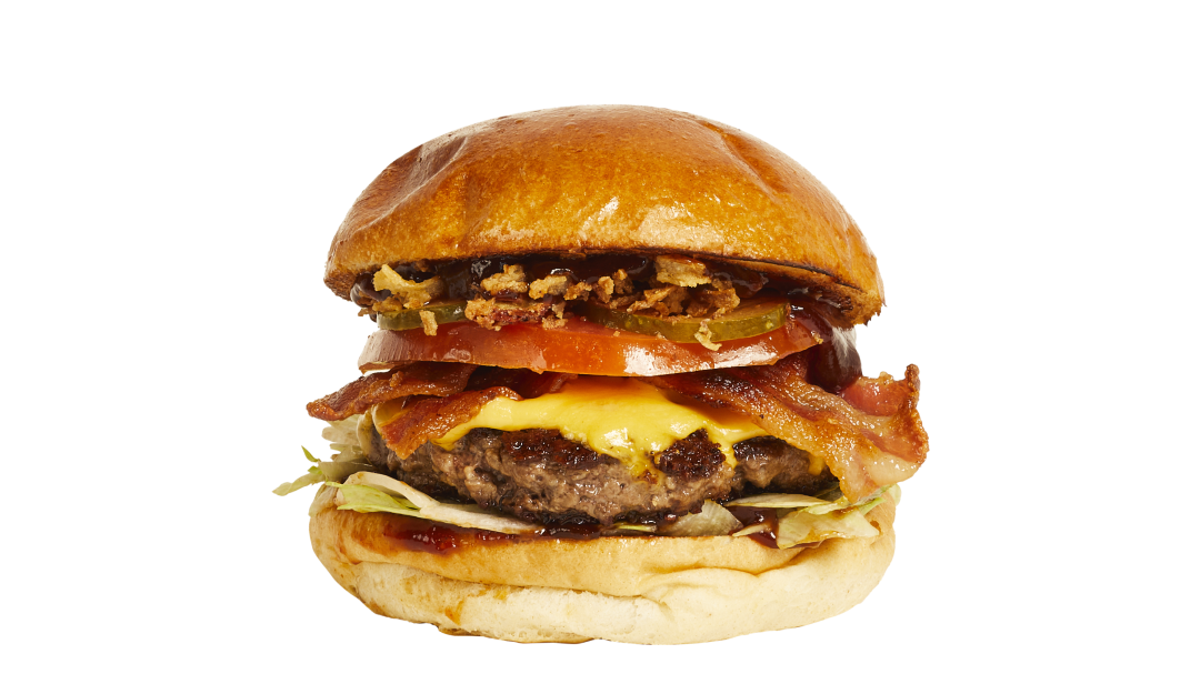 mit doppeltem Rindfleisch, Speck, Röstzwiebeln, Smoky Barbecuesoße, doppeltem Cheddar, Salat, Tomaten und Gurken