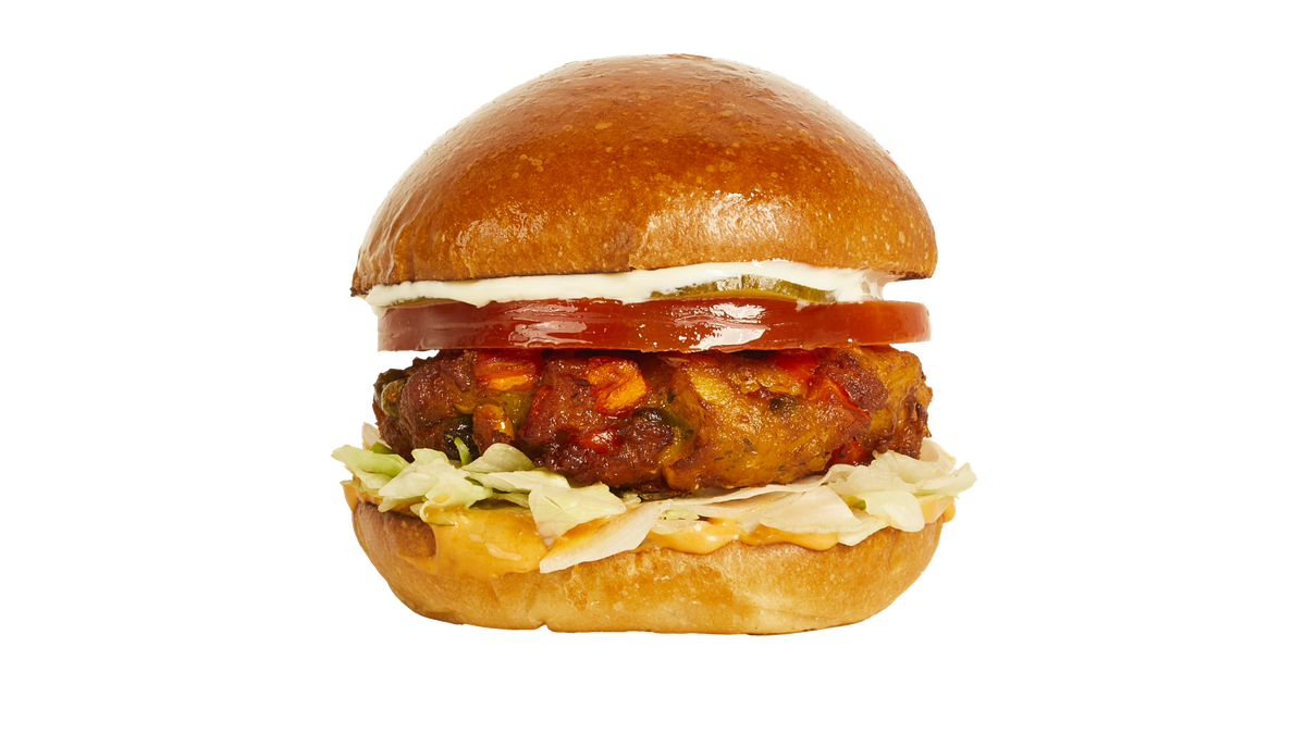 mit doppeltem Gemüsepatty, Limetten-Mayonnaise, Salat, Tomaten, Gurken und Burgersoße