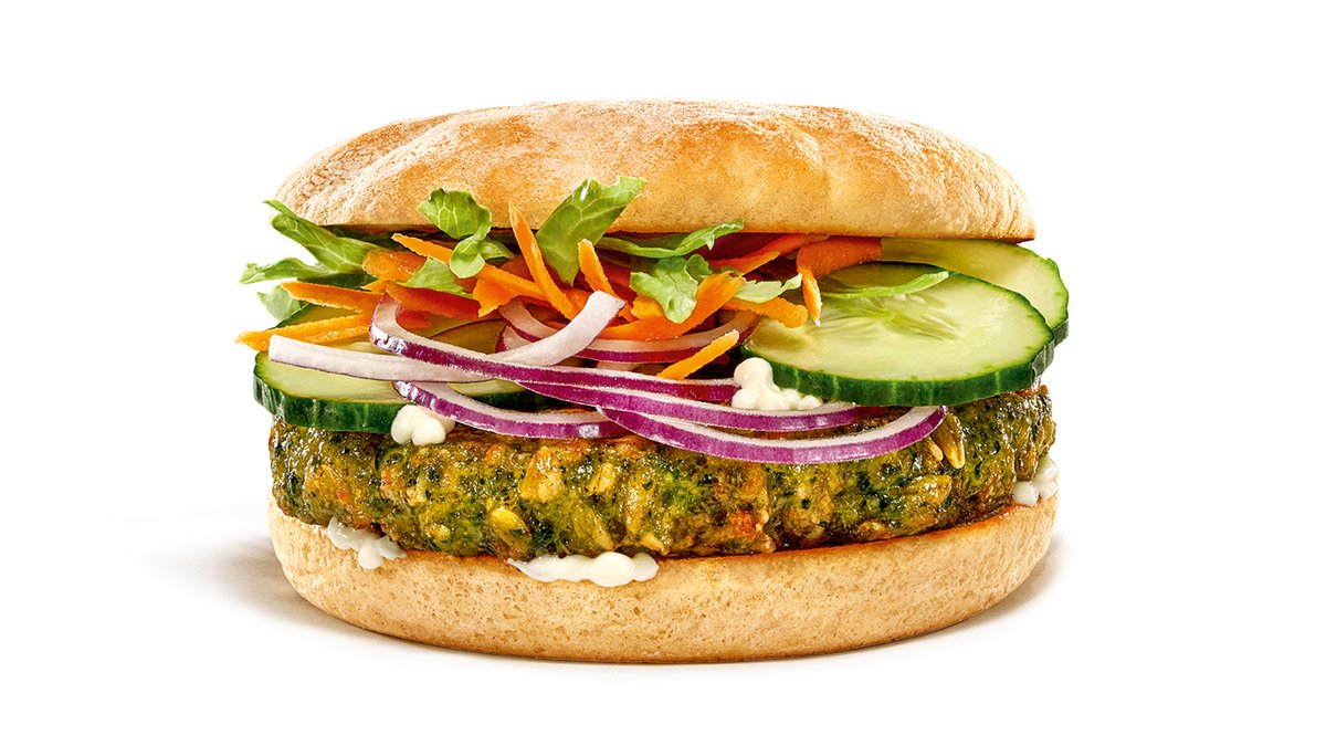 Gemüse ist mein Fleisch: Genieße ein leckeres Meatfree Farmer’s Patty mit roten Zwiebeln, frischer Gurke, geraspelten Möhren und knackigem Salat im Ciabatta Bun – verfeinert mit cremiger Mayonnaise. Einfach unglaublich lecker!