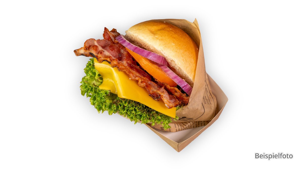 BBQ Soẞe, mit Tomaten, Gewürzgurken, Jalapeños, Röstzwiebeln, Bacon, Chesterkäse und Salat