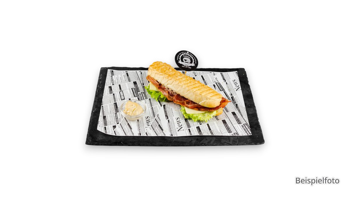 BBQ Soẞe, mit Tomaten, Gewürzgurken, Jalapeños, Röstzwiebeln, Bacon, Chesterkäse und Salat