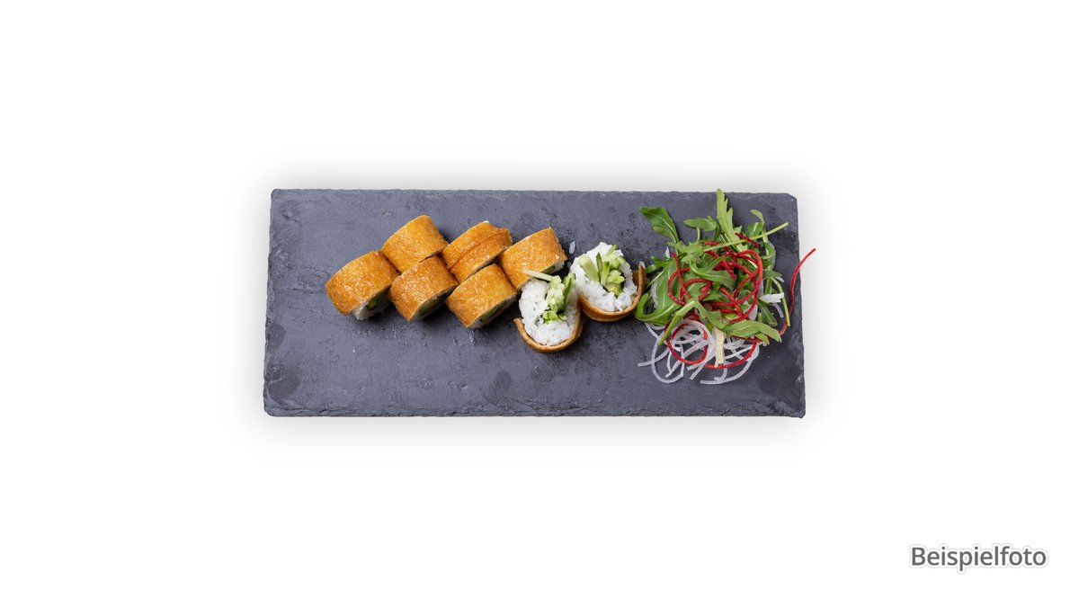 16 Stück 3x Maki Gurken 3x Maki Avocado 3x Maki Mango 3x Maki Rucola 2x Nigiri Avocado 2x Nigiri Tofutasche