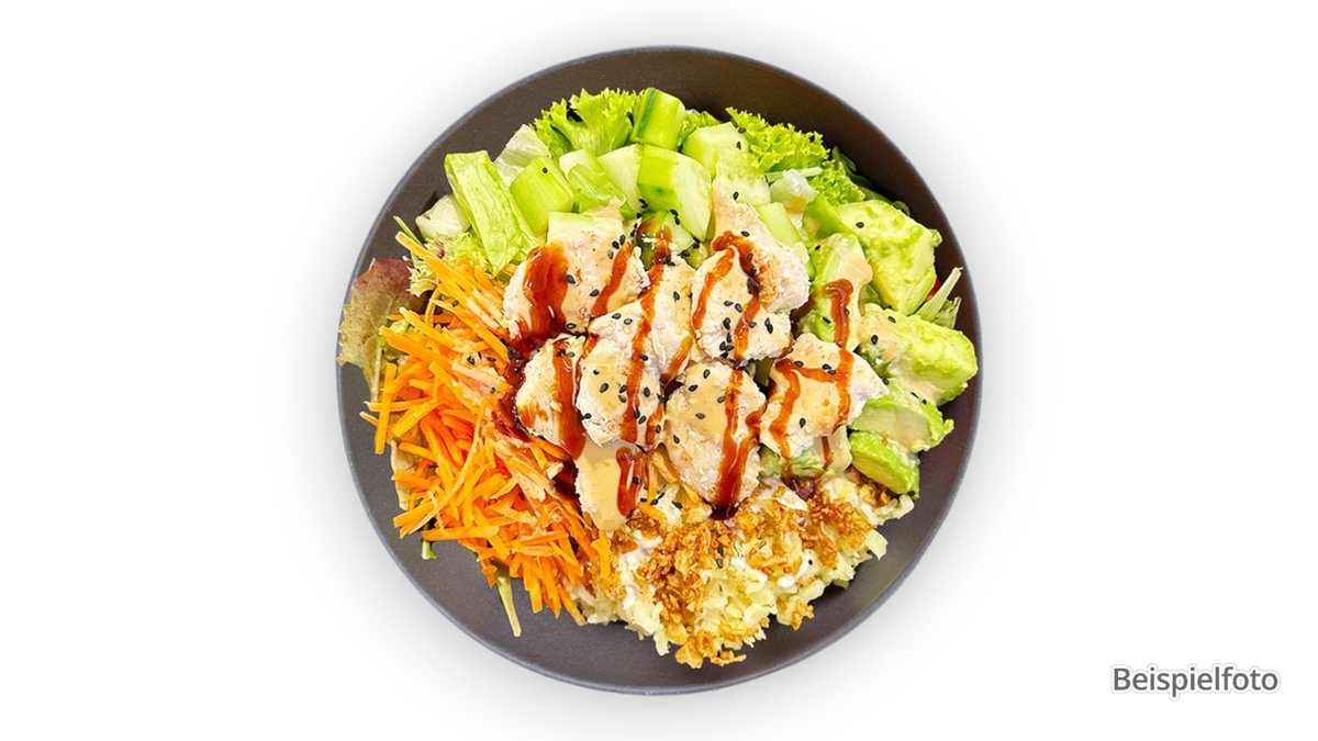 alle Bowls werden mit Avocado, Salat-Mix und einer Soße deiner Wahl zubereitet