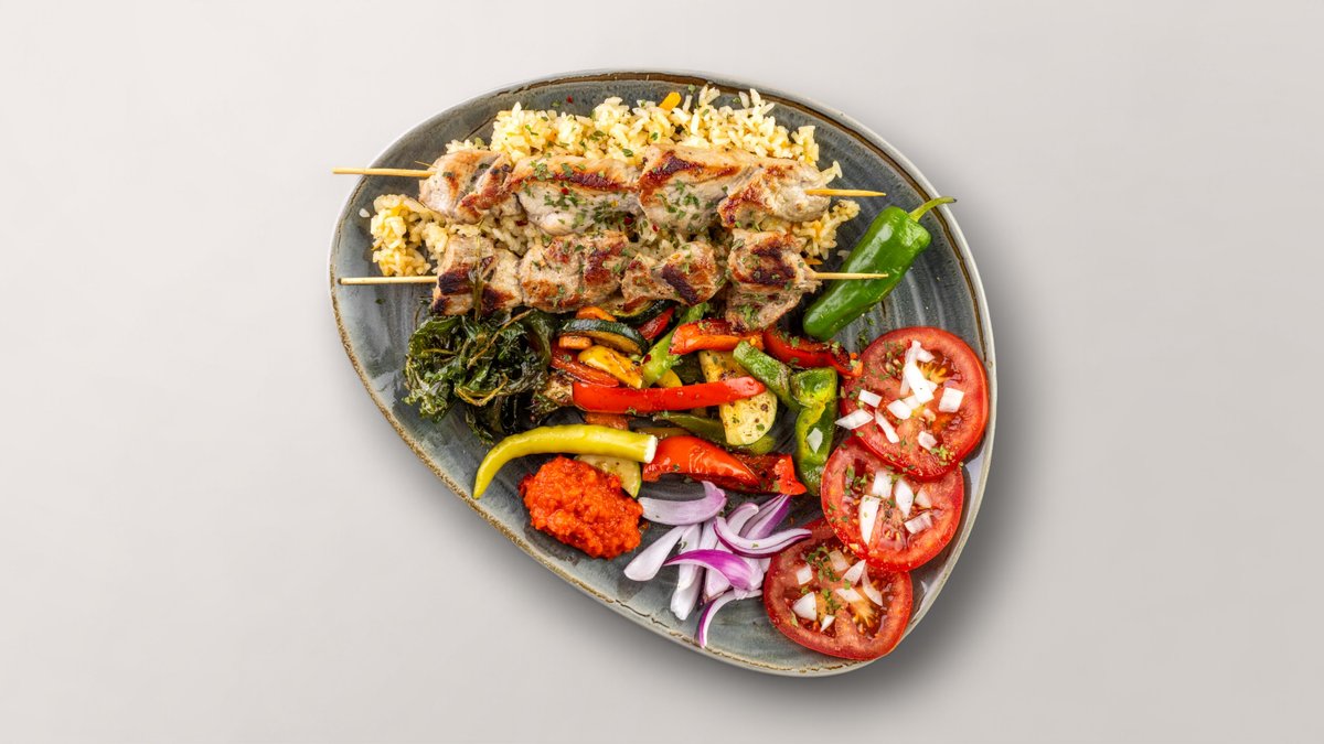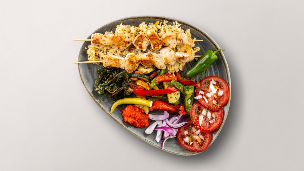 Entdecken Sie den Geschmack des Balkans mit unseren saftigen Hähnchenspießen, serviert auf einem Bett aus aromatischem Reis, garniert mit frischem, saisonalem gegrilltem Gemüse. Diese köstliche Kombination aus zart gegrilltem Hähnchen, perfekt gekochtem Reis und buntem Gemüse bietet eine harmonische Mischung aus Aromen und Texturen, die Ihren Gaumen erfreuen wird.