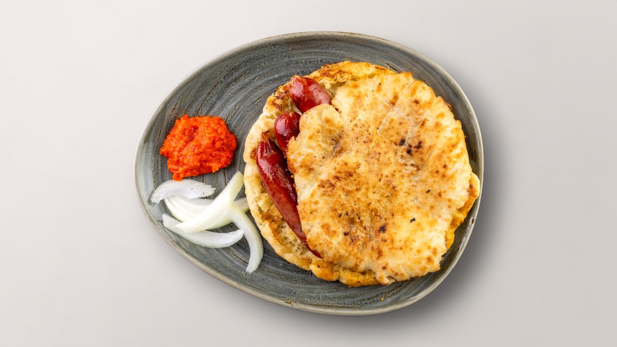 4 Hausgemachte Kalbswürstchen im Fladenbrot, sowie Ajvar und Zwiebeln.