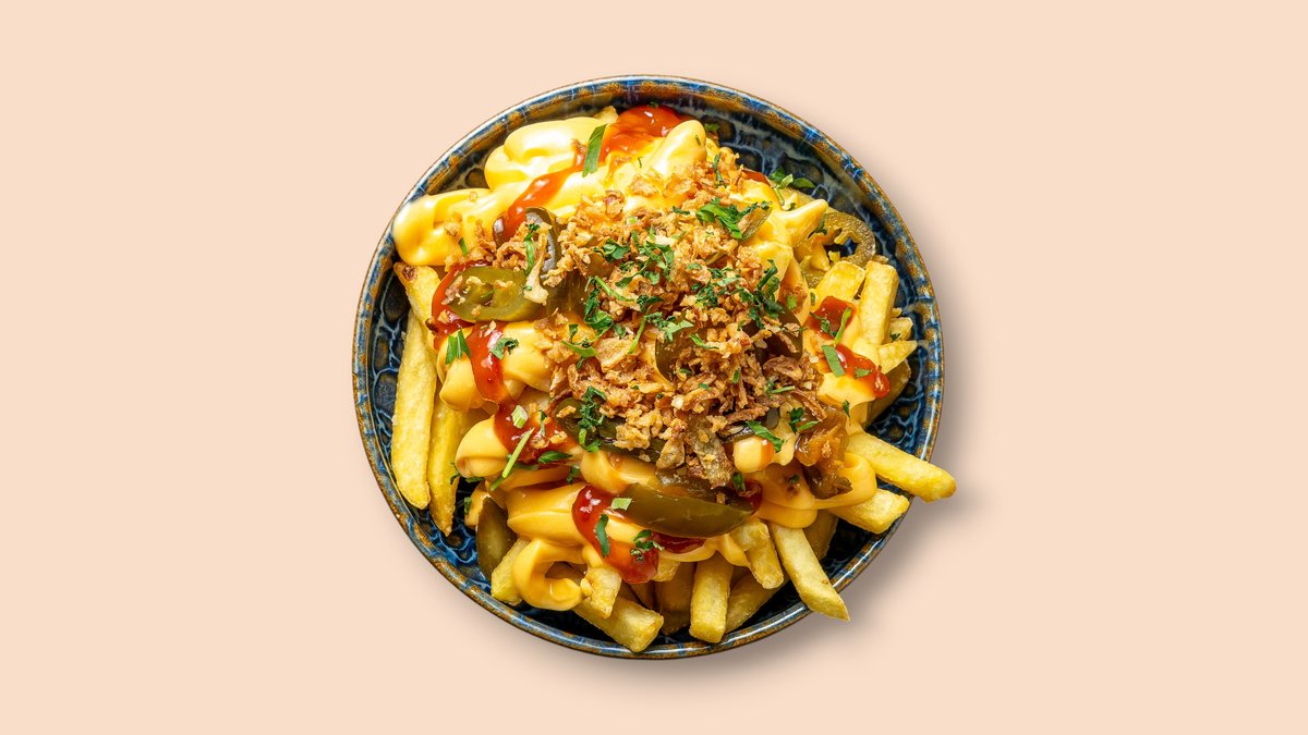 Pommes frites mit Käse-Chilisoße, Röstzwiebeln und Petersilie