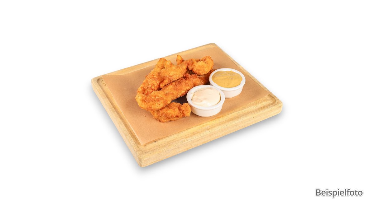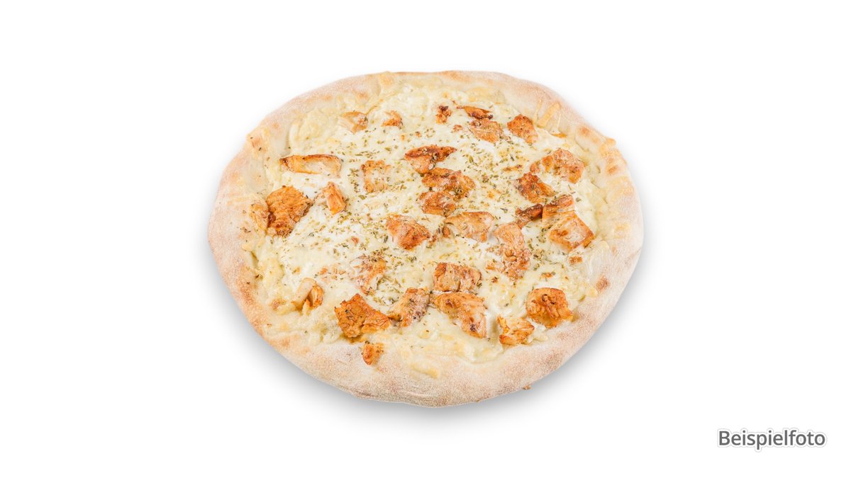 mit Tomatensoße, Käse, Hähnchenbruststreifen, Zwiebeln, Paprika, Mais, Lauchzwiebeln und Barbecuesoße