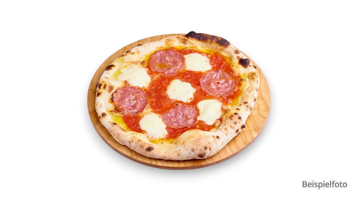 mit Tomatensoße, Käse, Salami vom Schwein, Kirschtomaten, Mozzarella, Rucola und Grana Padano